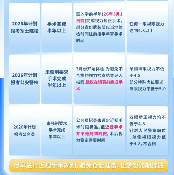 很多人误以为近视手术可以"立竿见影",实则不然。完整的术前检查需要时间,术后视力稳定通常需要一定周期。且各种不一样的术式恢复周期也各不相同。建议至少提前半年开始规划,确保在体检时达到最佳视力状态!