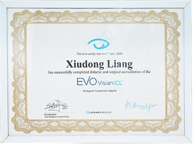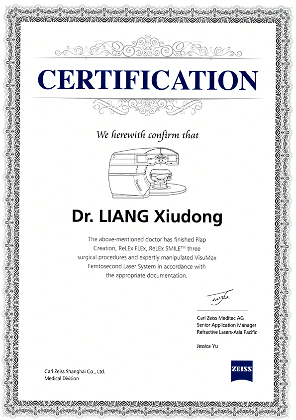 证书翻译:在此确认,梁秀栋医生已完成Flap Creation(角膜瓣制作)、RELEX FLEX(半飞秒)、RELEX SMILE™(全飞秒)三种手术,并熟练操作了visumax飞秒激光系统