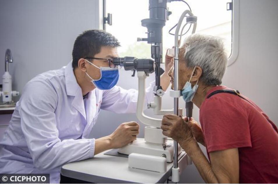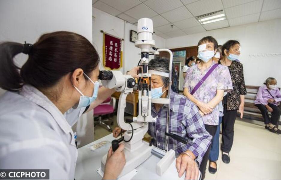 2022年7月6日,江西省吉安市吉水县人民医院,医生在对接受白内障复明手术的患者进行术后复检。CICPHOTO/谢东 摄