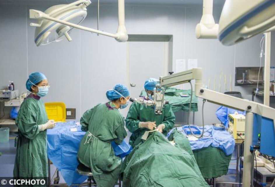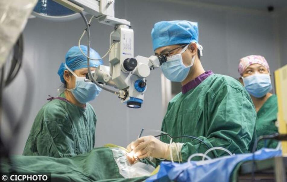 022年7月5日,在江西省吉安市吉水县人民医院手术室,医生在为白内障老年患者实施复明手术。CICPHOTO/谢东 摄