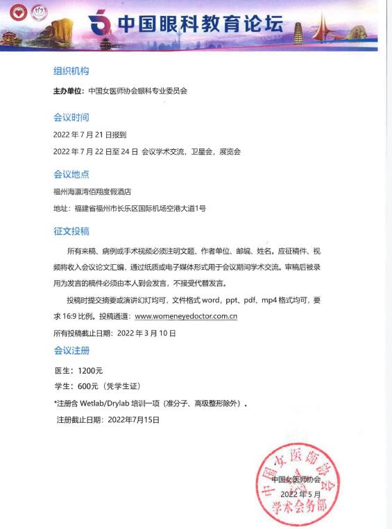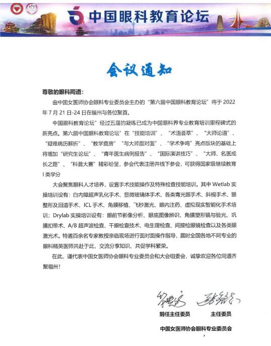 由中国女医师协会眼科专业委员会主办的“第六届中国眼科教育论坛”将于2022年7月21日-24日在榕城——福州与各位聚首。