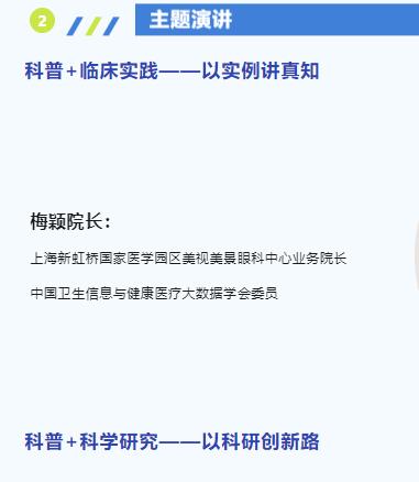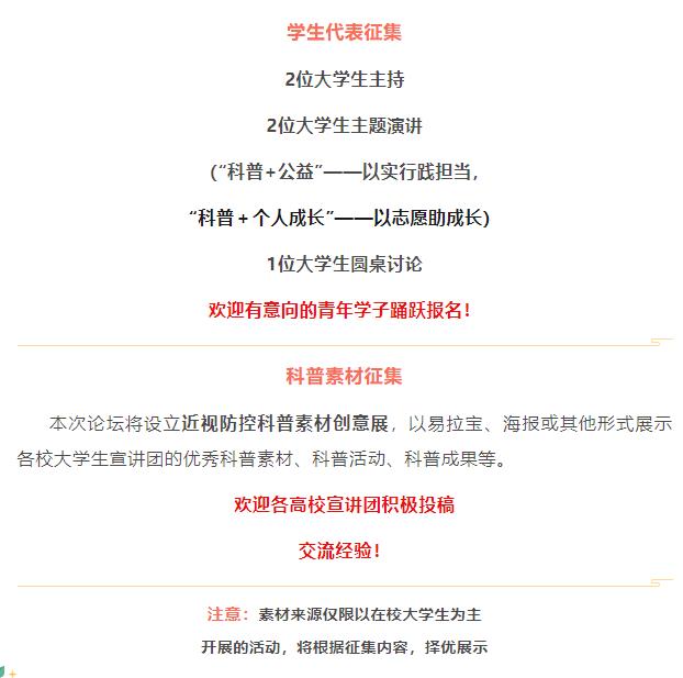 这是属于大学生的专场,不仅是学习的平台,也是展示的舞台。今年,我们特邀全国近视防控领域知名专家与大学生宣讲团学生代表齐聚一堂,以近视防控“科普+”为核心,发表观点,共同探讨,拓宽思路。