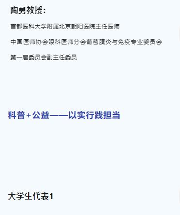陶勇教授:首都医科大学附属北京朝阳医院主任医师;中国医师协会眼科医师分会葡萄膜炎与免疫专业委员会第一届委员会副主任委员。