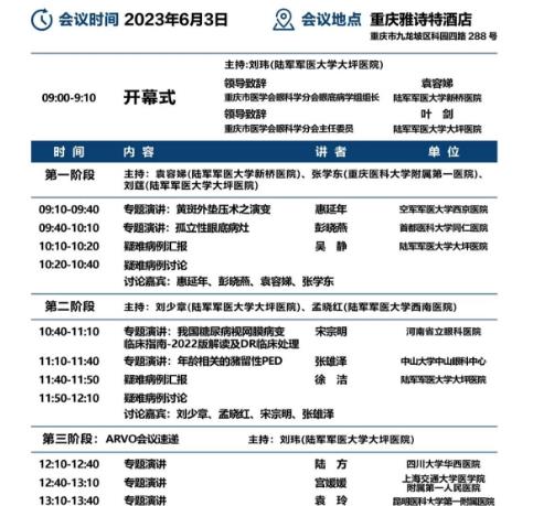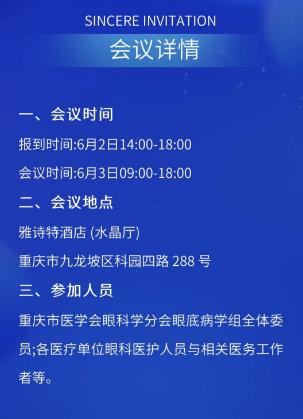 由重庆市医学会主办、市医学会眼科学分会眼底病学组承办的“重庆市医学会眼科学分会2023年眼底病学组学术会议暨大坪眼科眼底病论坛”将于 2023 年6月2-3 日在重庆举行。