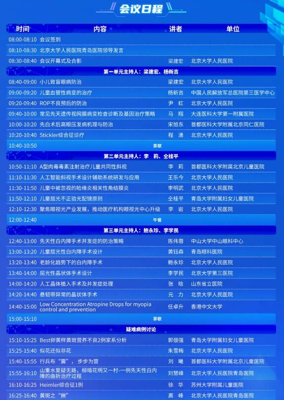 第五届全国儿童盲及低视力防治学习班暨北京大学人民医院青岛医院首届复杂白内障高峰论坛会议通知。多位眼科医生参与并进行眼科疾病演讲,共同提高眼病治疗水平。