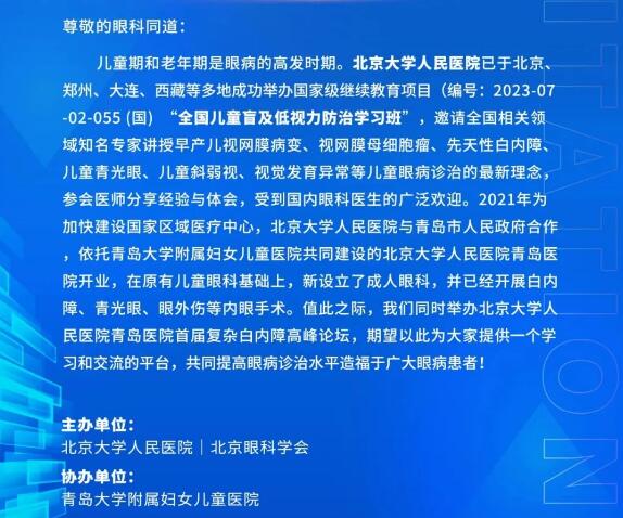 第五届全国儿童盲及低视力防治学习班暨北京大学人民医院青岛医院首届复杂白内障高峰论坛会议通知