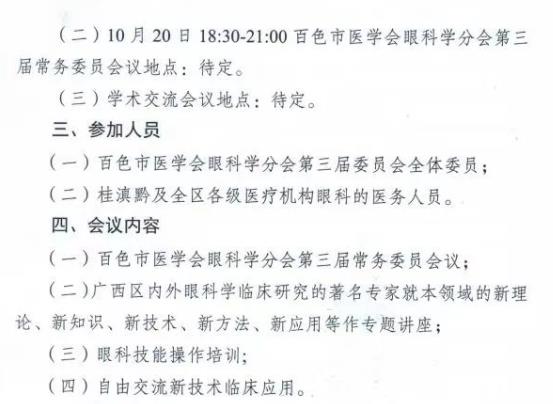 为促进我市及周边桂滇黔各县(市)的眼科学科医疗技术、学术与医疗质量管理水平的提高,为贯彻党的二十大精神,践行“党的初心使命,守护光明”经研究,定于2023年10月20-22日在百色城区举办百色市医学会眼科学分会2023年学术年会暨第三届八桂红城眼科论坛。届时将邀请区内外眼科学专家作专题学术讲座,现将会议有关事项通知如下: