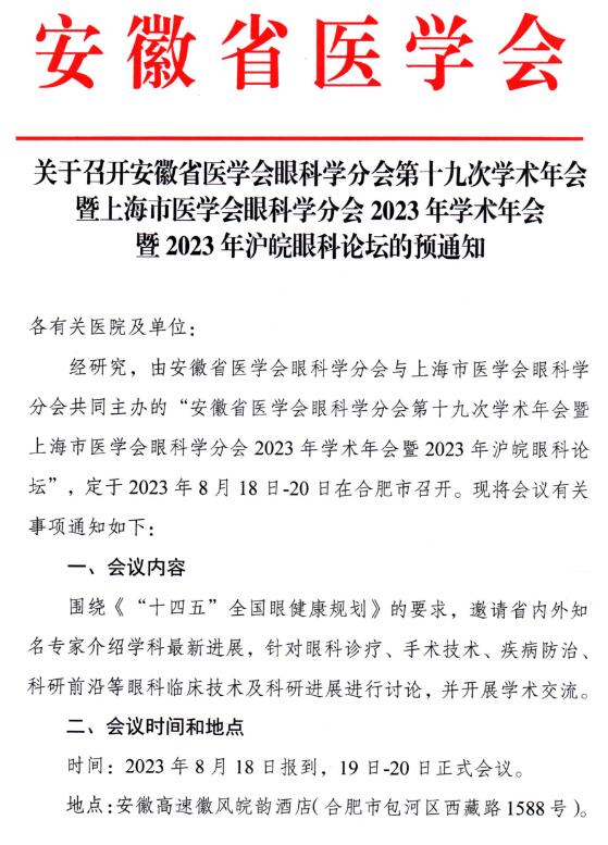 安徽省医学会眼科学分会第十九次学术年会暨上海市医学会眼科学分会2023年学术年会暨2023年沪皖眼科论坛