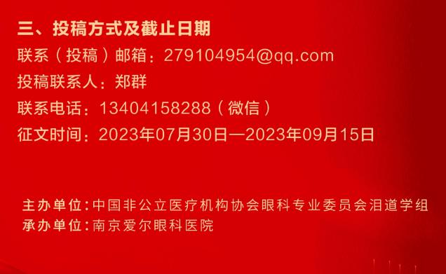 第十三届全国泪道微创手术学习班将于2023年10月27日-10月29日在南京爱尔眼科医院举办,同时将进行《儿童泪道疾病微创手术研讨会》,现将活动征文相关事宜通知如下: