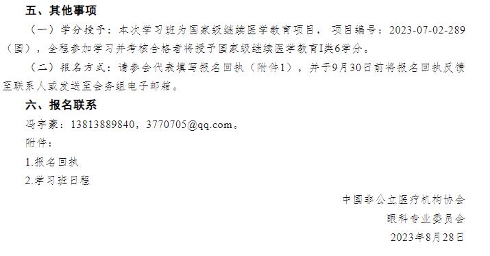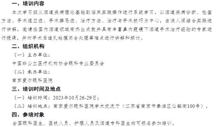 为规范眼科医生泪道疾病实用诊疗技术及操作流程,保障患者安全,推动眼科医学事业发展,促进学术交流,中国非公立医疗机构协会眼科专业委员会拟定于2023年10月26-29日在江苏省南京市举办国家级继续医学教育项目“泪道疾病实用诊疗技术学习班”。本次学习班面向全国眼科及泪道专科医生,以理论为基础,临床实用为目的,分别就先天性泪道疾病、获得性泪道疾病诊疗进行系统授课和病例分享。现将学习班有关事宜通知如下: