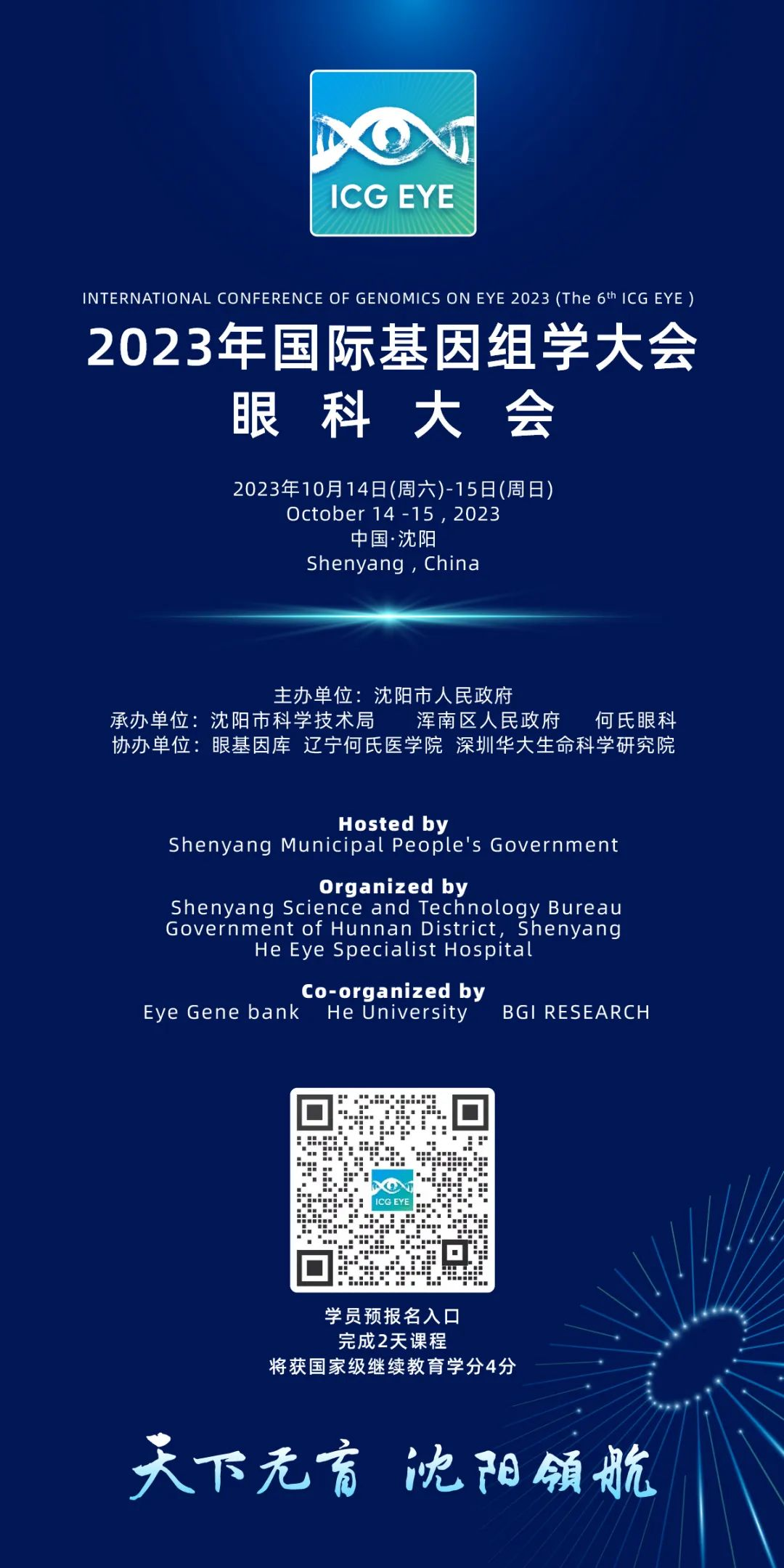 为促进基因组学与眼科学、干细胞治疗、生物医学等多领域的跨界融合,推动精准医疗产业发展、推动眼健康事业发展,由沈阳市人民政府主办,沈阳市科学技术局、浑南区人民政府、何氏眼科承办,眼基因库、辽宁何氏医学院、深圳华大生命科学院协办的“2023年国际基因组学大会眼科大会 (The 6th ICG EYE)”将于2023年10月14日—15日在沈阳召开。