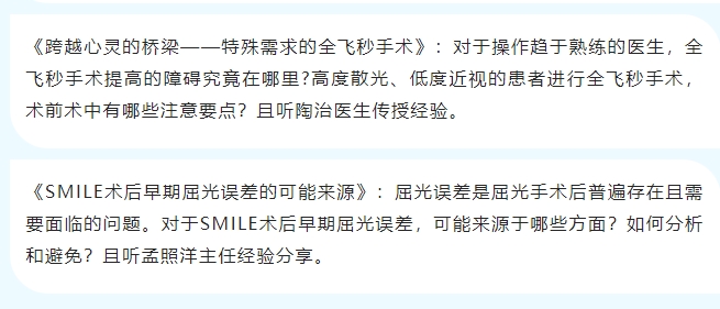 本次会议将围绕屈光手术中的特殊和疑难病例分享,并由专家进行点评。大会将邀请北京大学第三医院陈跃国教授、北京嘉悦丽格眼科医院李耀宇教授担任主持。