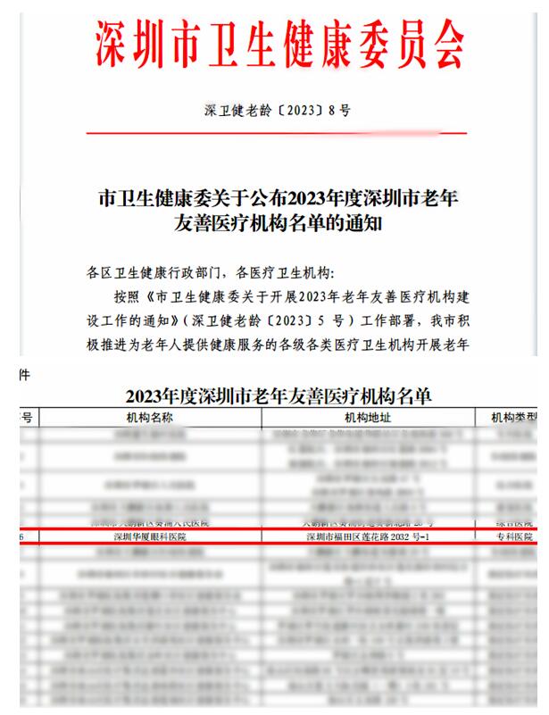 近日,深圳市卫生健康委公布了2023年度深圳市老年友善医疗机构名单,深圳华厦眼科医院榜上有名,这一殊荣既是对深圳华厦眼科医院多年来致力于为长者提供专业医疗服务的认可,也是对其高质量医疗服务的肯定。