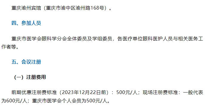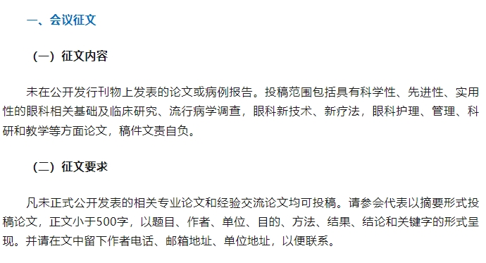 本次大会将邀请全国眼科领域的著名专家学者进行专题报告、疑难病例讨论、临床规范解读、手术直播、手术视频展示、优秀论文评选等精彩内容,为广大眼科同仁提供一次绝好的学习机会和学术交流平台。我们诚挚邀请您参加本次会议,共同促进眼科事业的发展。现将有关事宜通知如下: