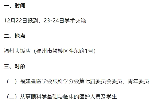 为促进我省眼科学的发展,由福建省医学会眼科学分会主办的福建省第二十二次眼科学术会议暨眼科新进展学习班将于2023年12月22-24日在福州召开。会议将邀请省内外知名眼科专家作专题学术报告,并进行优秀论文交流。欢迎广大眼科学界同道踊跃投稿并参加会议。