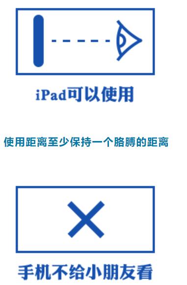 两岁以下的孩子杜绝玩电子产品,学龄段的孩子每次使用电子产品时要伸直胳膊,把屏幕的位置放在伸直的胳膊之外。