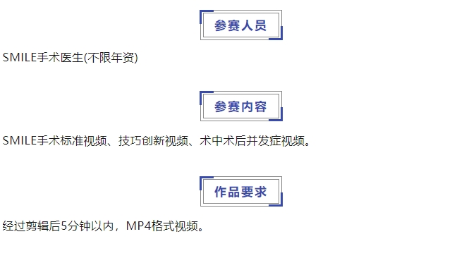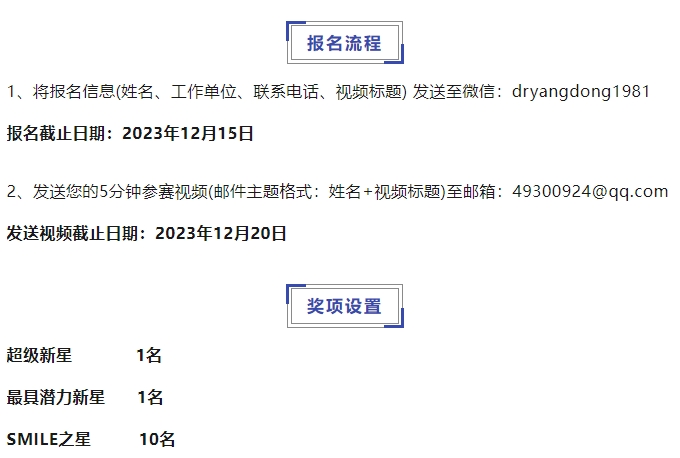 本次“SMILE之星新年全国擂台赛”将分两个阶段,第一阶段视频海选,第二阶段视频决赛,各路手术大咖为您点评,相信会让每位分享者收获满满,SMILE之星待您开启!