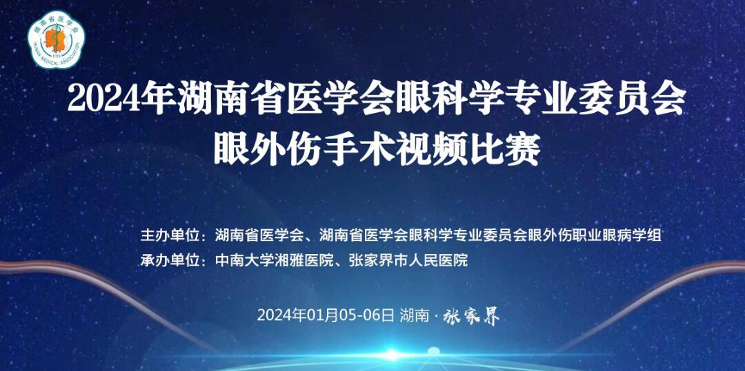 由湖南省医学会、湖南省医学会眼科学专业委员会眼外伤职业眼病学组主办,中南大学湘雅医院、张家界市人民医院承办的“2024年湖南省医学会眼科学专业委员会眼外伤手术视频比赛”将于 2024年1月在张家界市举行。会议将邀请国内眼科医学知名专家作精彩报告,并围绕眼科学科建设及人才培养等内容展开交流。