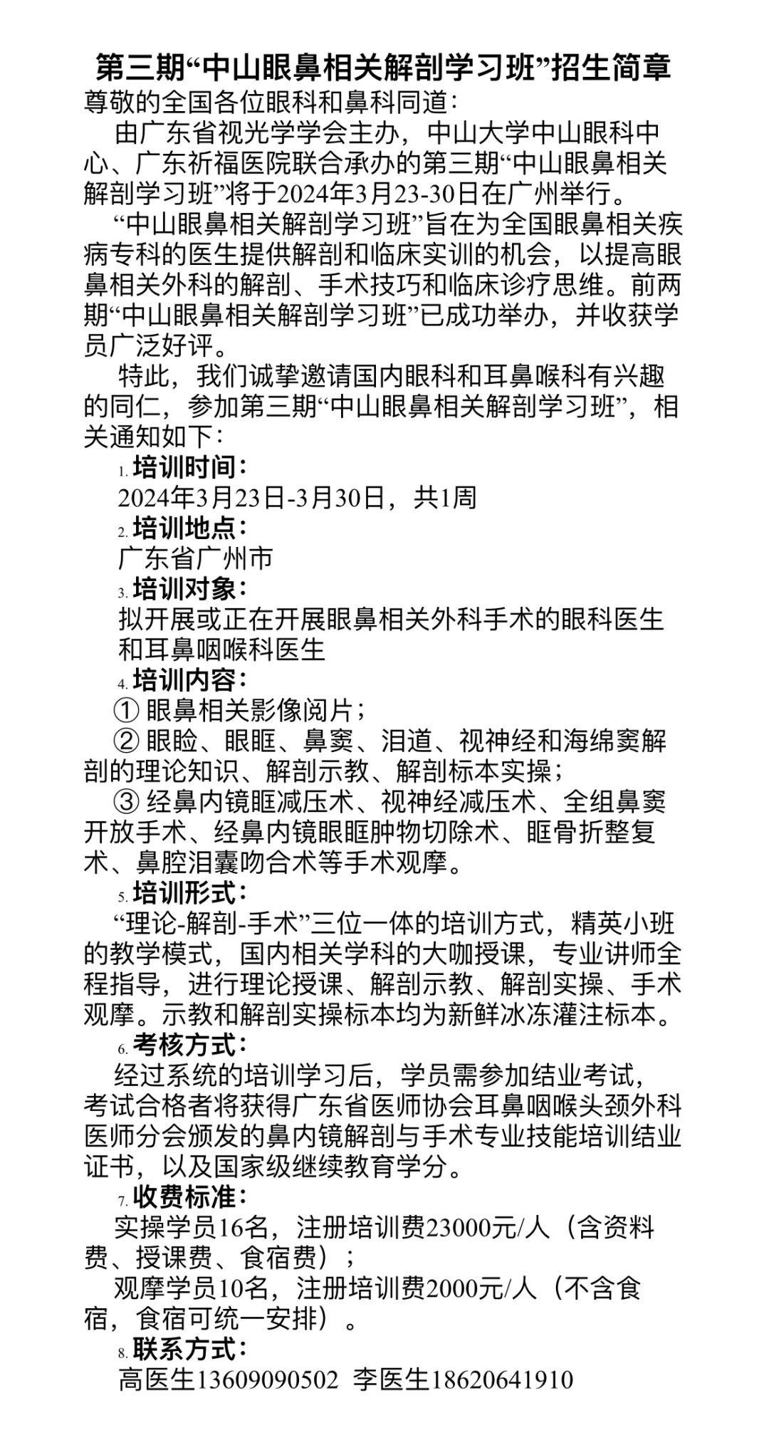 第三期“中山眼鼻相关解剖学习班”,将于2024年3月23-30日在广州举办,过往期期精彩,干货满满有兴趣参加的医生,欢迎参会。