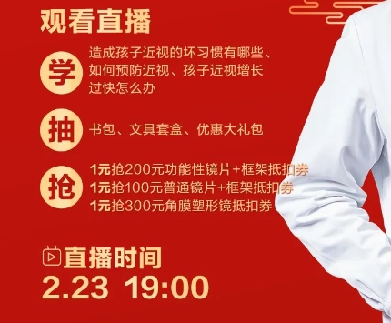 视不宜迟 睛彩新学期,2月23日(本周五)下午19:00武汉普瑞眼科医院,视光及小儿眼科针对学生群体,开展开学季近视防控科普直播,超多福利好礼限时抢购。