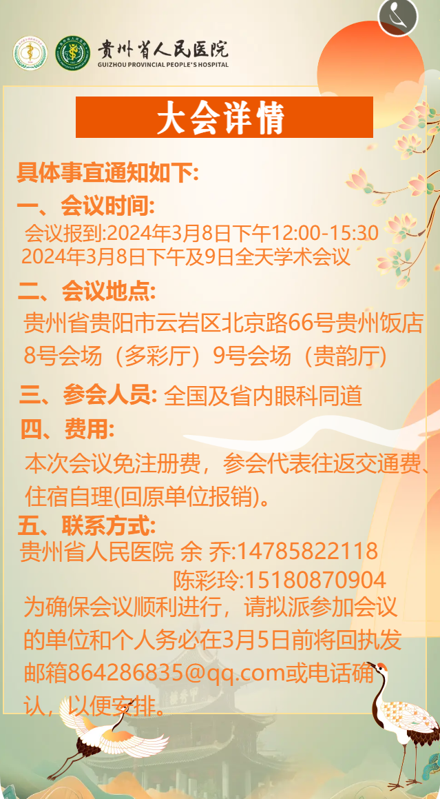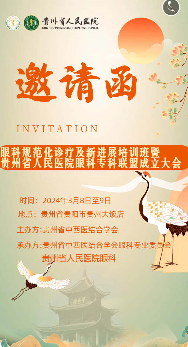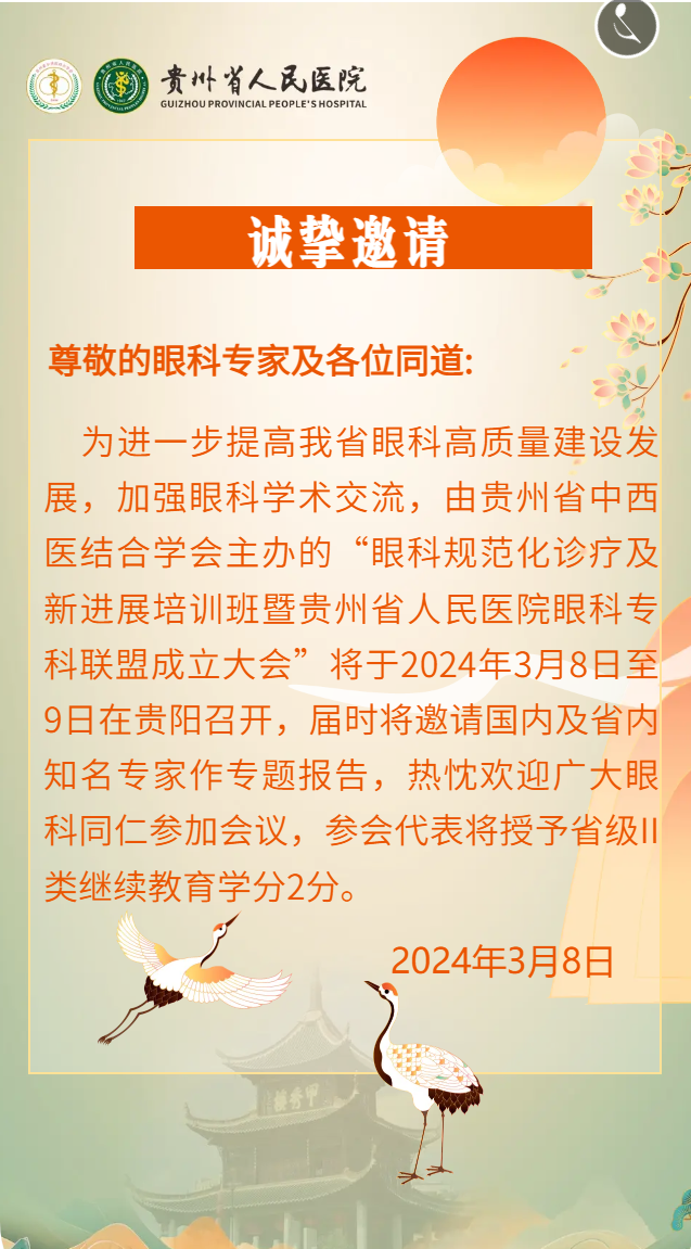 为进一步提高我省眼科高质量建设发展,加强眼科学术交流,由贵州省中西医结合学会主办的“眼科规范化诊疗及新进展培训班暨贵州省人民医院眼科专科联盟成立大会”将于2024年3月8日至9日在贵阳召开。