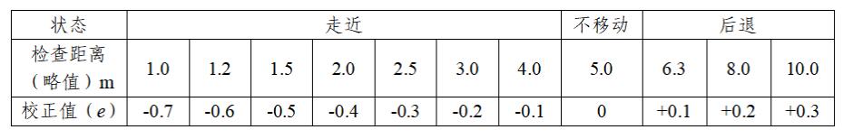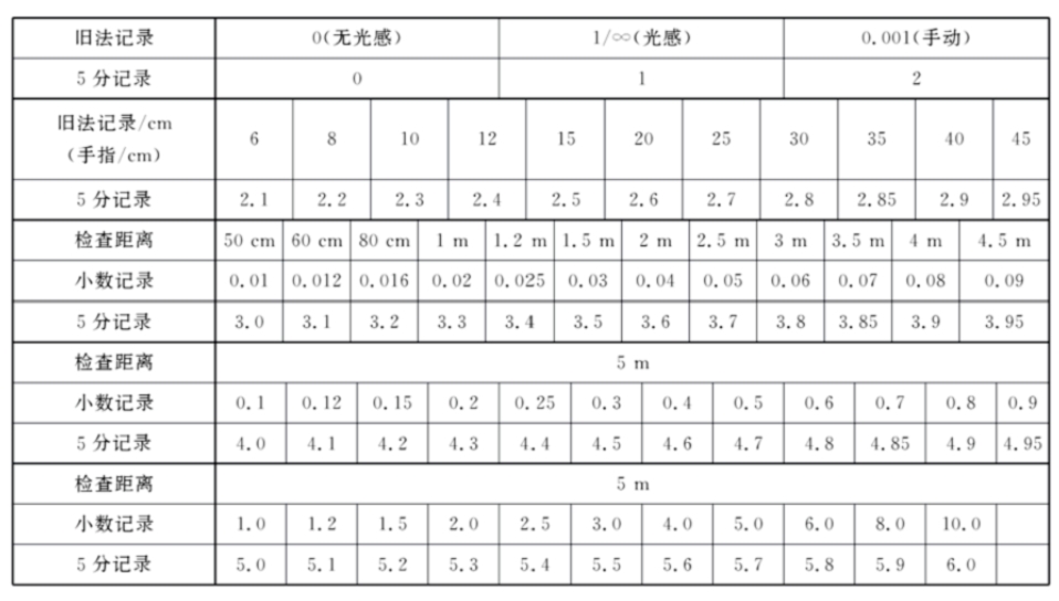 b)被检者向远视力表走近至表1左侧所列某一检查距离时,测得的5分记录值加相应校正值e后即为其实际视力;