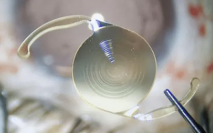 人工晶体是经手术植入眼睛里、代替摘除的自身混浊晶体的精密光学部件,可折叠,展开直径约6mm。