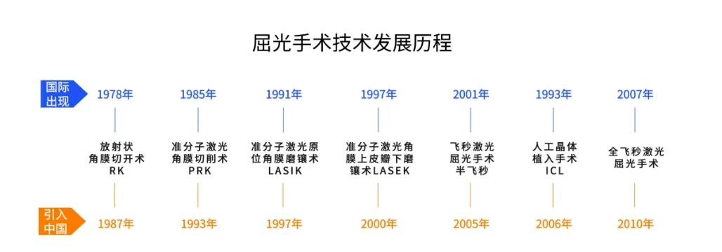 从1978年的放射状角膜切开术(PK),到2007年的全飞秒激光屈光手术,无论是手术的类型和技术都有了质的飞跃。