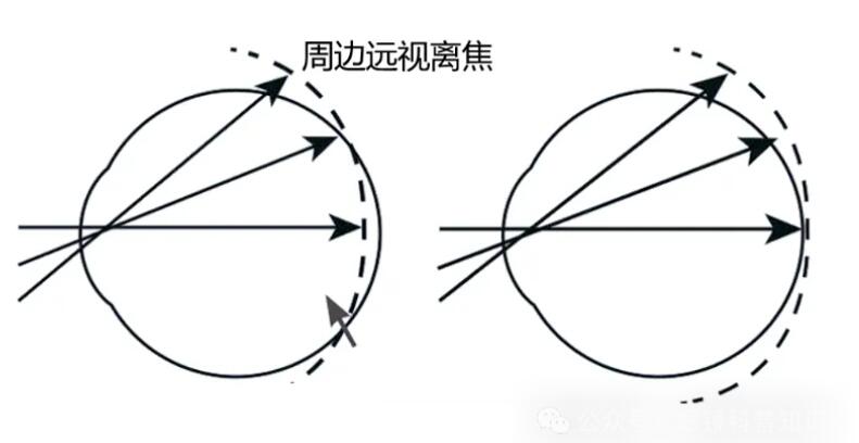 左侧是配戴欠矫单光眼镜的成像模式图,右侧为配戴度数准确的单光眼镜成像模式图。二者的区别在于度数准确的眼镜可以使成像精准的落在黄斑区的视网膜上,因此视物清楚,而欠矫眼镜成像仍然在黄斑部的视网膜前,因此看东西仍然不清楚。二者的相同点是在周边部的视网膜上,光线会聚焦在视网膜后,也就是形成周边部的远视离焦。
