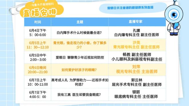 我们将围绕近视防控、白内障治疗、青光眼防治、眼底病治疗、摘镜手术等患者关注度高的热点话题,提供实用的爱眼护眼建议,同时,针对暑假的到来,6月7号和8号的直播间里,还为大家准备了互动好礼。