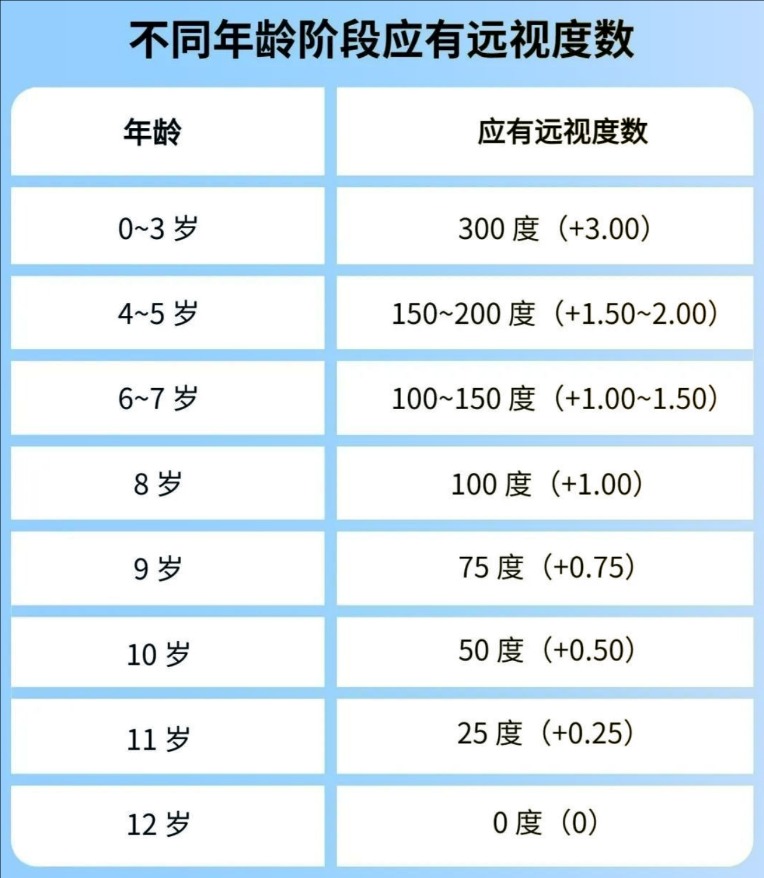 这里给大家总结了一份不同年龄孩子应有的远视度数: