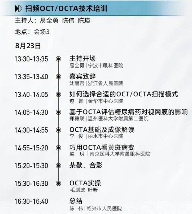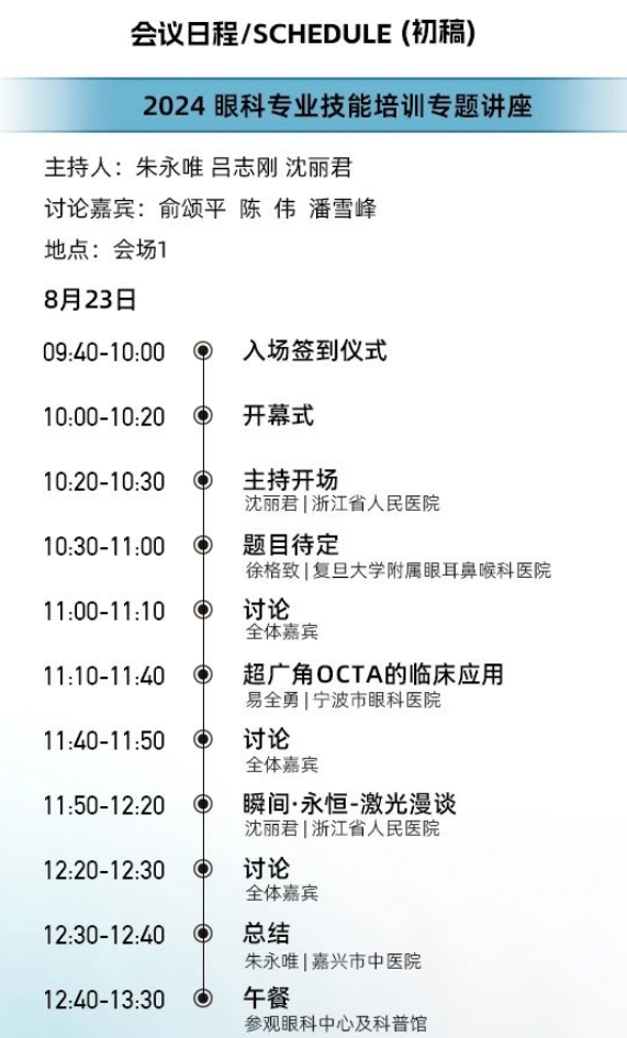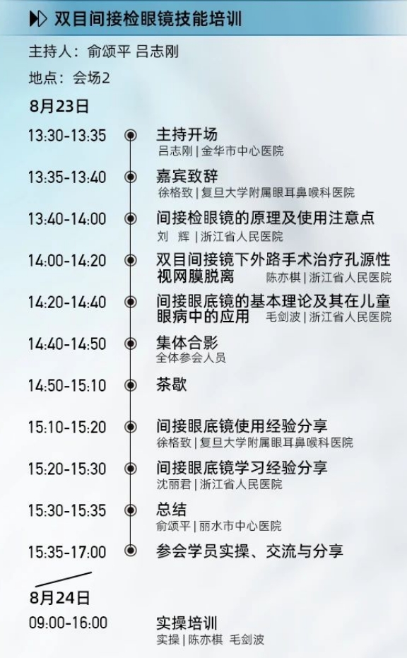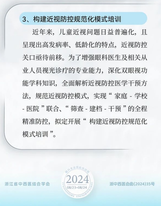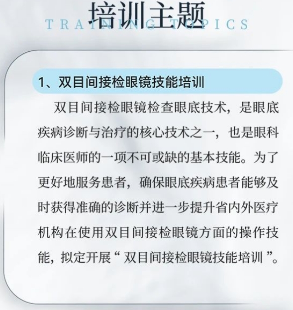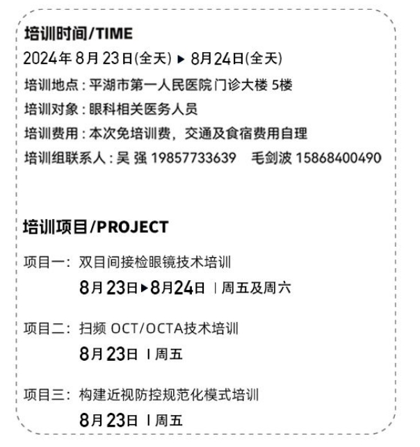 为进一步提升眼科医生诊疗水平、加快眼科人才队伍培养,由浙江省中西医结合学会主办,浙江省中西医结合学会眼科专委会承办,浙江省人民医院眼科中心和平湖市第一人民医院协办的“2024 眼科专业技能培训(期)",定于2024年8月23日-24日在浙江省嘉兴地区举办。本次培训将采取理论授课、技能培训和现场实操的形式进行,特邀浙江省中西医结合学会眼科专业委员会的专家及国内相关领域知名教授,围绕眼底疾病诊疗、间接检眼镜检查技术、扫频0CT/0CTA技术、近视防控等领域,讲授相关基础理论、培训实操技能、并了解最新研究应用进展。通过培训,以期达到在临床实战中能独立操作、评估病情、综合诊疗的能力。