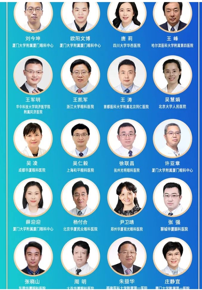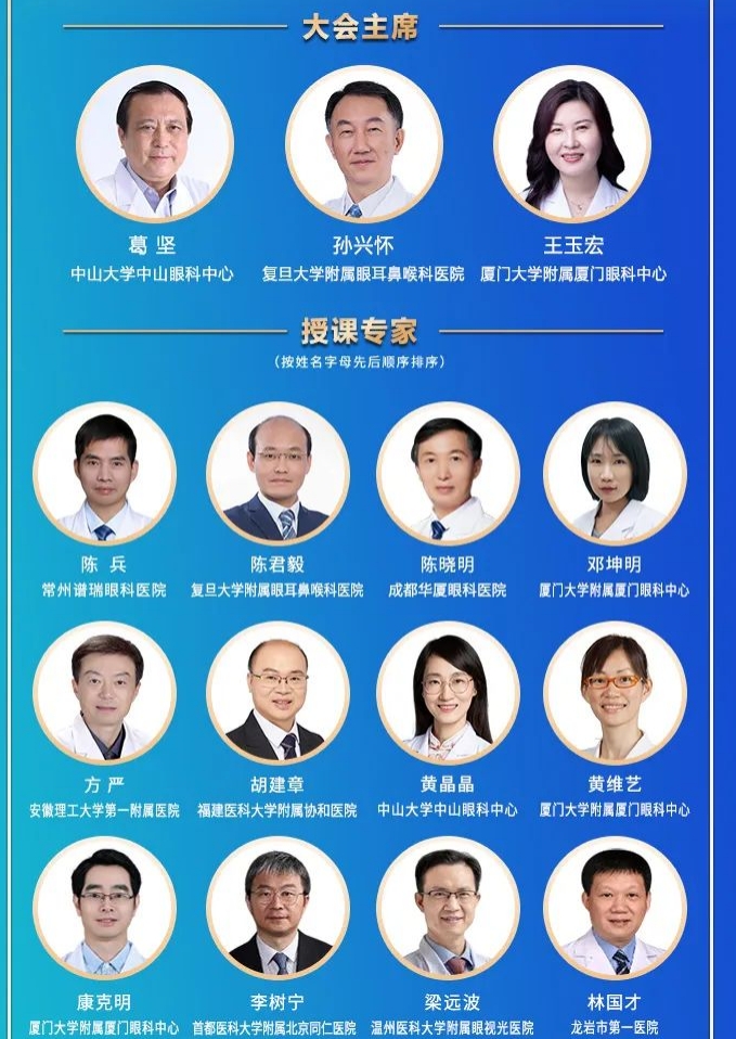 本届论坛主席由华厦眼科医院集团战略发展学术委员会主任、中山大学中山眼科中心葛坚教授,中华医学会眼科学分会候任主委、华厦眼科医院集团创新委员会主席孙兴怀教授,厦门大学附属厦门眼科中心青光眼学科带头人王玉宏主任共同担任。此外还邀请了国内众多知名眼科专家作为授课讲师强势助阵,为全省、全国眼科医生提供一场高规格高水平的学术盛宴。