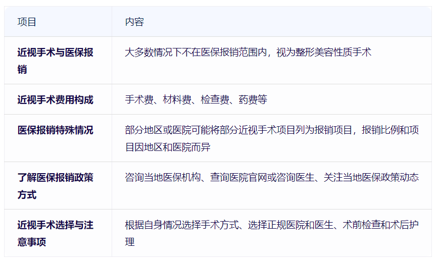 近视矫正手术通常不在医保报销范围,被视为美容性质。费用包括手术、材料、检查等。部分地区或医院可能有特殊报销政策,建议咨询当地医保机构或医院。