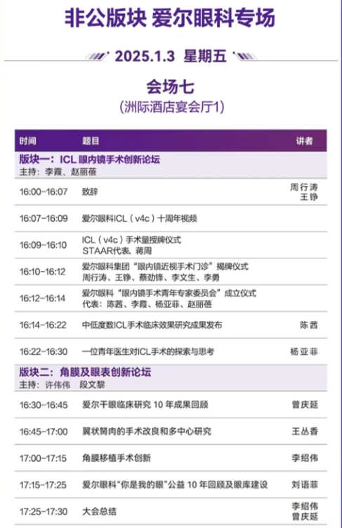 1月3日,会议还设立爱尔眼科专场论坛。复旦大学附属眼耳鼻喉科医院院长、上海市眼视光学研究中心主任周行涛教授,爱尔眼科屈光手术学组学科带头人、爱尔眼科医院集团广东省区总院长王铮教授,爱尔眼科医院集团角膜及眼表学组组长、爱尔角膜病研究所所长李绍伟教授等10余位眼科专家将齐聚一堂、深入“沪”动,围绕“ICL创新发展”“角膜及眼表疾病诊疗创新”等议题进行分享交流。