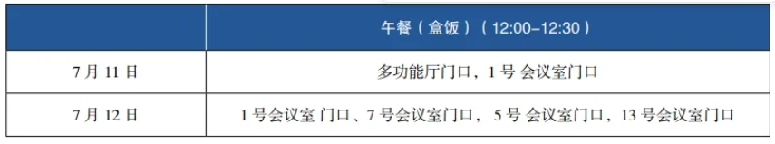 现场报到后凭报到流程卡领取午餐盒饭领取券(7月11日-12日午餐)。请凭餐券到指定地点用餐。