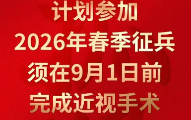 “男儿何不带吴钩,收取关山五十州。” 每当读到这句诗,心中是否涌起一股热血,渴望投身军旅,保家卫国?如今,2026 年春季征兵的战鼓已经敲响,怀揣军旅梦的你,是否已经准备好接受祖国的挑选?但在这里,有一个关键信息要特别提醒近视的热血青年:若需通过近视手术达到视力标准,务必在 2025 年 9 月 1 日前完成手术!这可不是一句空话,而是关乎你能否顺利踏入军营的重要时间节点。