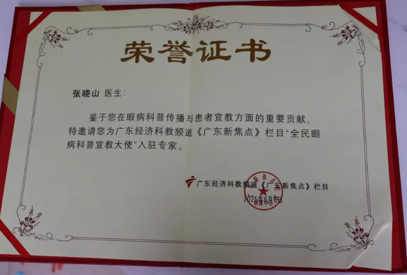 东莞华厦眼科张晓山院长荣膺广东经济科教频道《广东新焦点》“全民眼病科普宣教大使”
