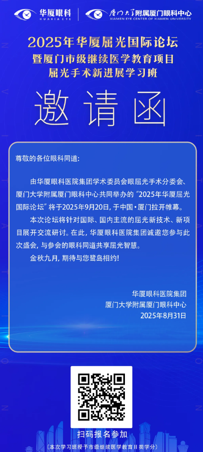 由华厦眼科医院集团学术委员会眼屈光手术分委会、厦门大学附属厦门眼科中心共同举办的“2025年华厦屈光国际论坛”将于2025年9月20日在美丽的鹭岛厦门举行。