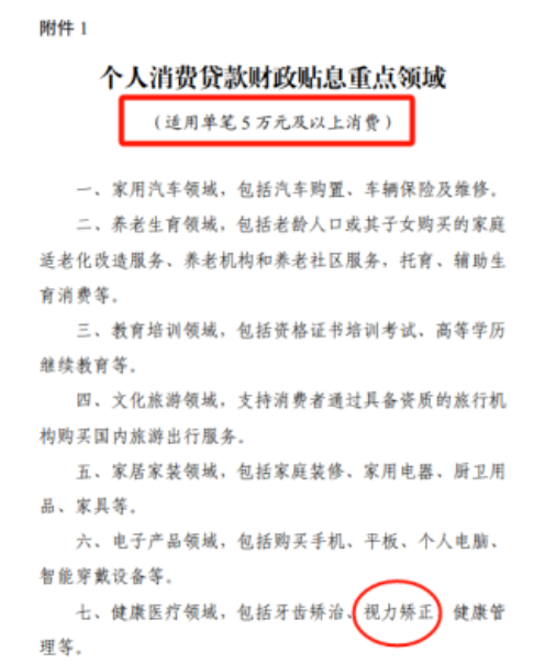 2025年8月,国家三部门联合印发《个人消费贷款财政贴息政策实施方案》,明确宣布对符合条件的个人消费贷款给予财政贴息支持,其中特别将“视力矫正”列入健康医疗重点支持领域。