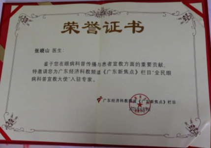 东莞华厦眼科张晓山院长荣膺广东经济科教频道《广东新焦点》“全民眼病科普宣教大使”