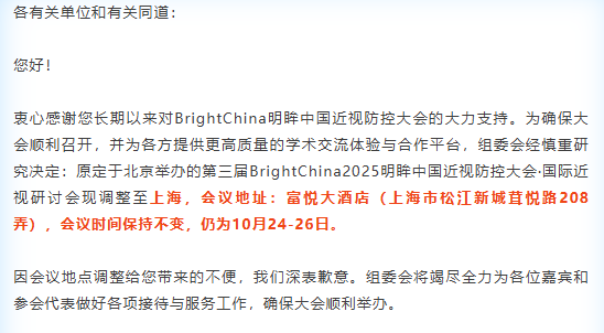 衷心感谢您长期以来对BrightChina明眸中国近视防控大会的大力支持。为确保大会顺利召开,并为各方提供更高质量的学术交流体验与合作平台,