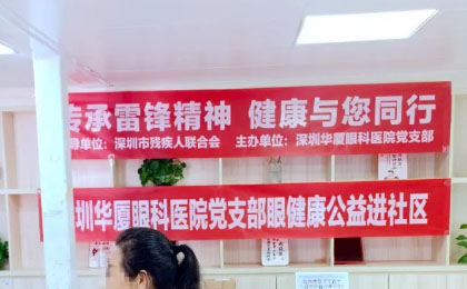 深圳华厦眼科医院党支部眼健康公益进皇岗社区。工作人员提醒居民们定期进行眼健康体检,以便及早预防、发现和治疗眼部疾病,并提倡保持良好的用眼习惯