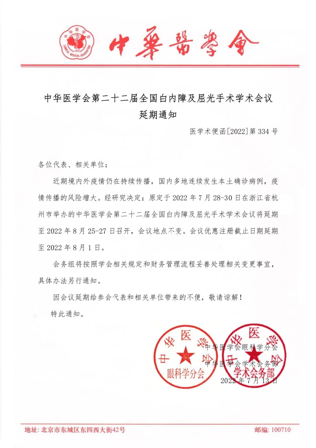 原定于2022年7月28-30日在浙江省杭州市举办的中华医学会第二十二届全国白内障及屈光手术学术会议将延期至2022年8月25-27日召开,